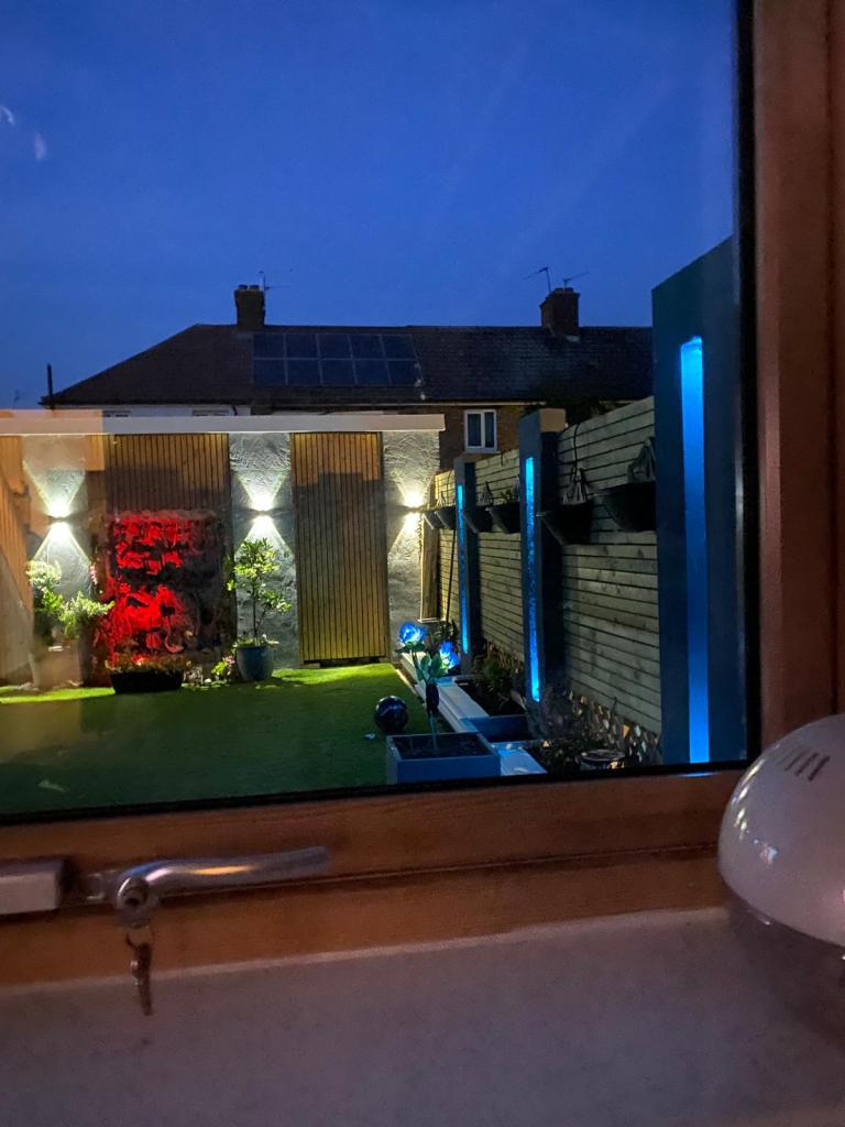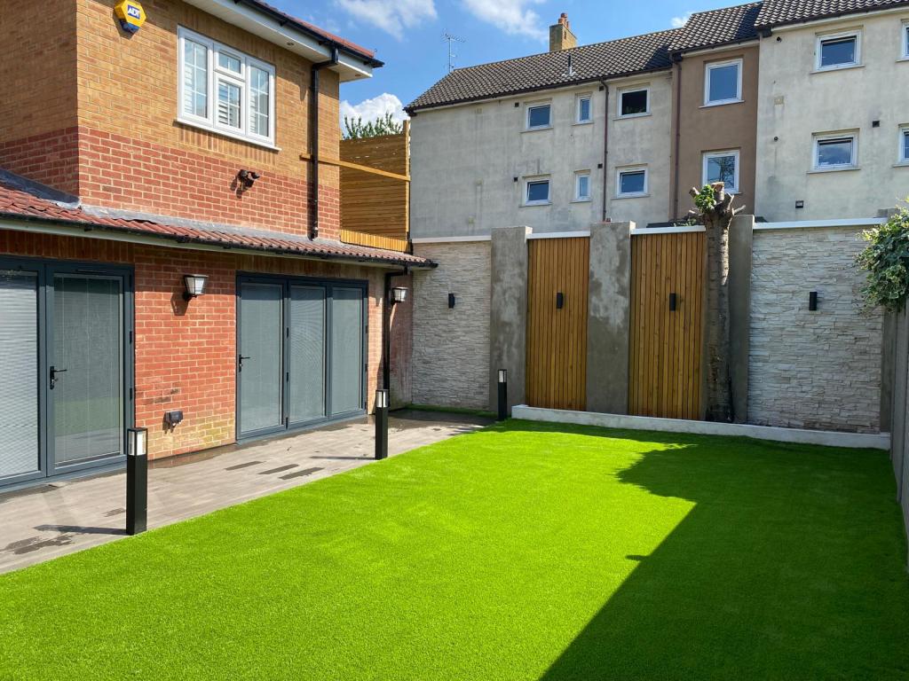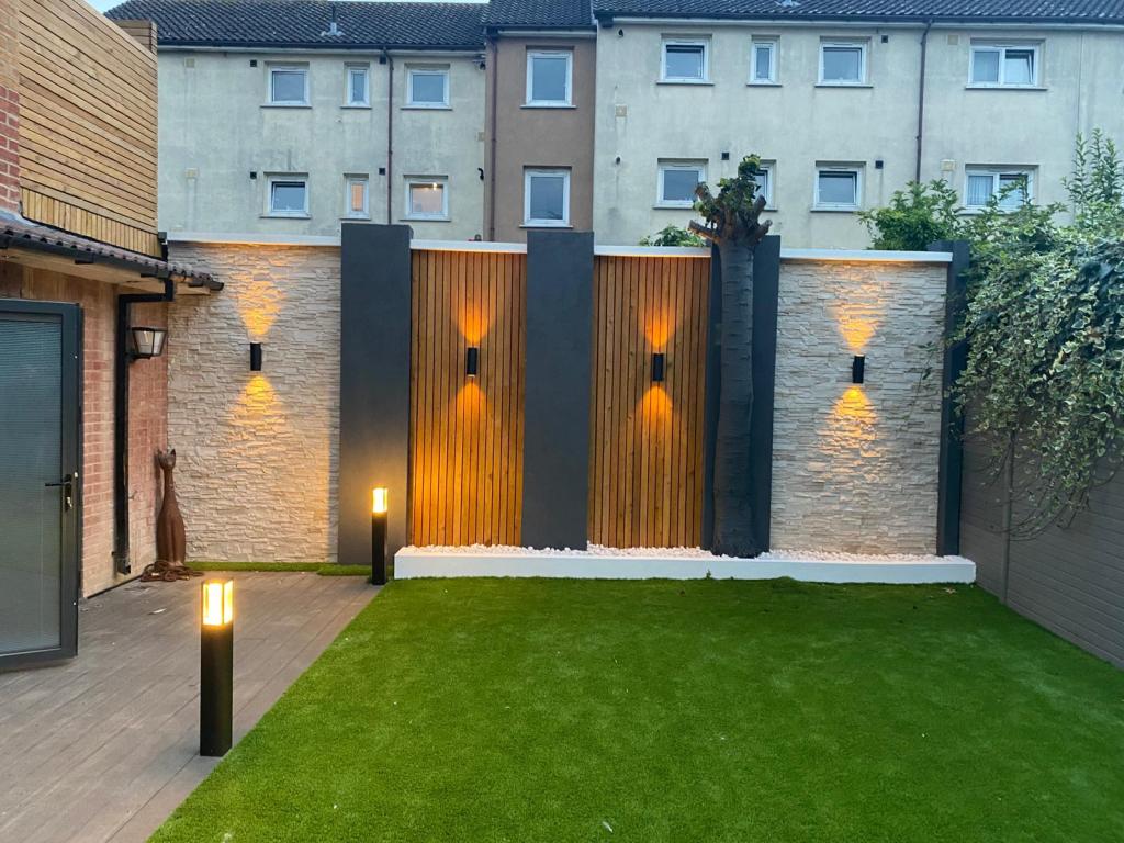 This project showcases a well-lit backyard featuring artificial grass, a decorative wall with textured stone and wooden slats and elegant lighting fixtures. Wall-mounted and ground-level lights create a warm and inviting ambiance, highlighting the modern design. A perfect blend of functionality and aesthetics for a cozy outdoor retreat!